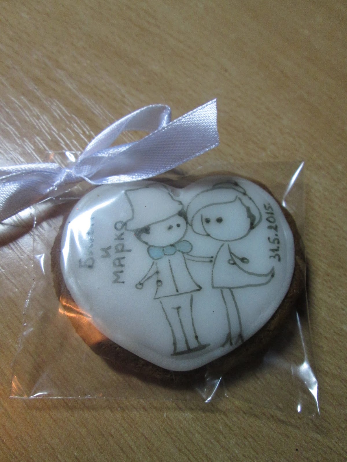 Izrada ovih medenjaka je vrlo jednostavna-standardni recept i rojal glazura, tekst ispisan Eurowiltonovom olovkom.Svaki medenjak je upakovan u celofan kesicu i vezan belom masnicom.To je za goste, a za njih, na poklon od mene, par meda mladenaca, da se i oni zaslade.